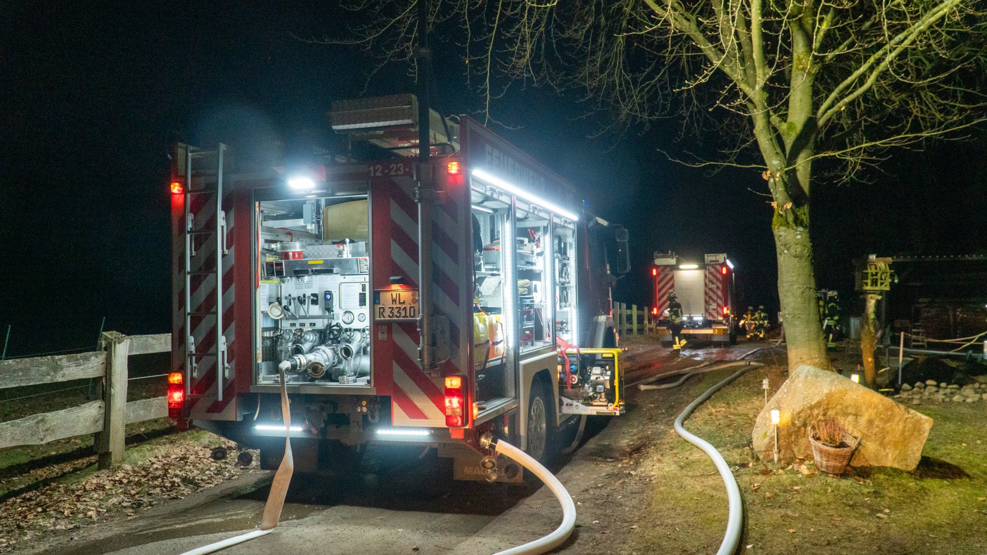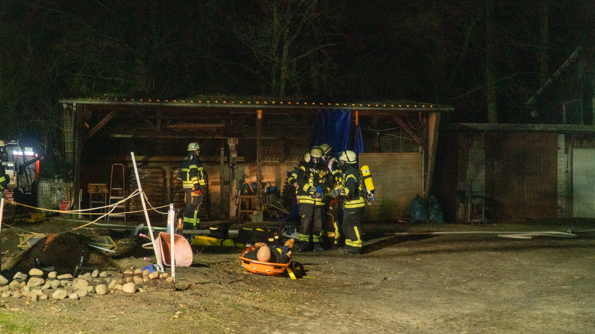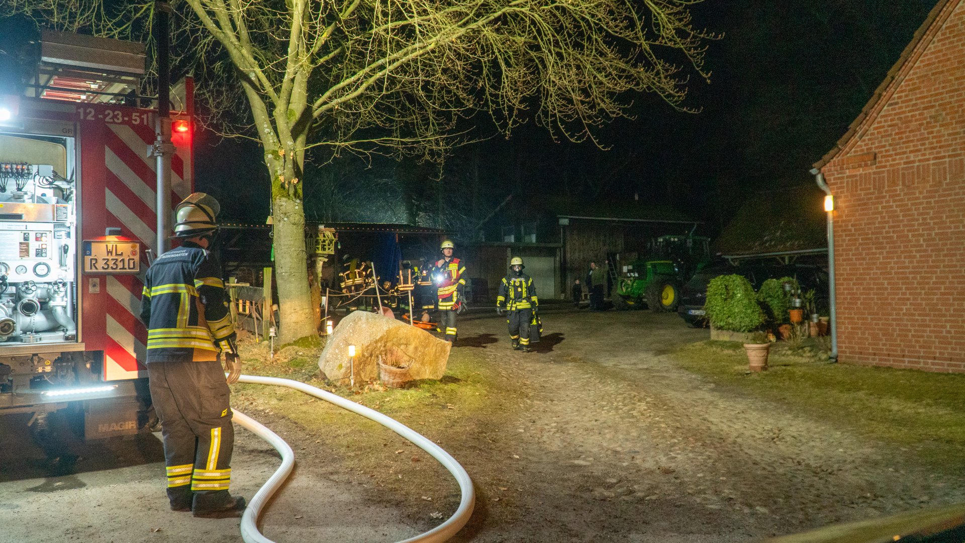 Ein Trupp unter Atemschutz konnte die erste Person im Gebäude finden und retten. Die zweite Person wurde auf der Rückseite der Scheune entdeckt und war schwer in einer landwirtschaftlichen Maschine eingeklemmt. Auch diese Person konnte durch die Einsatzkräfte befreit werden.