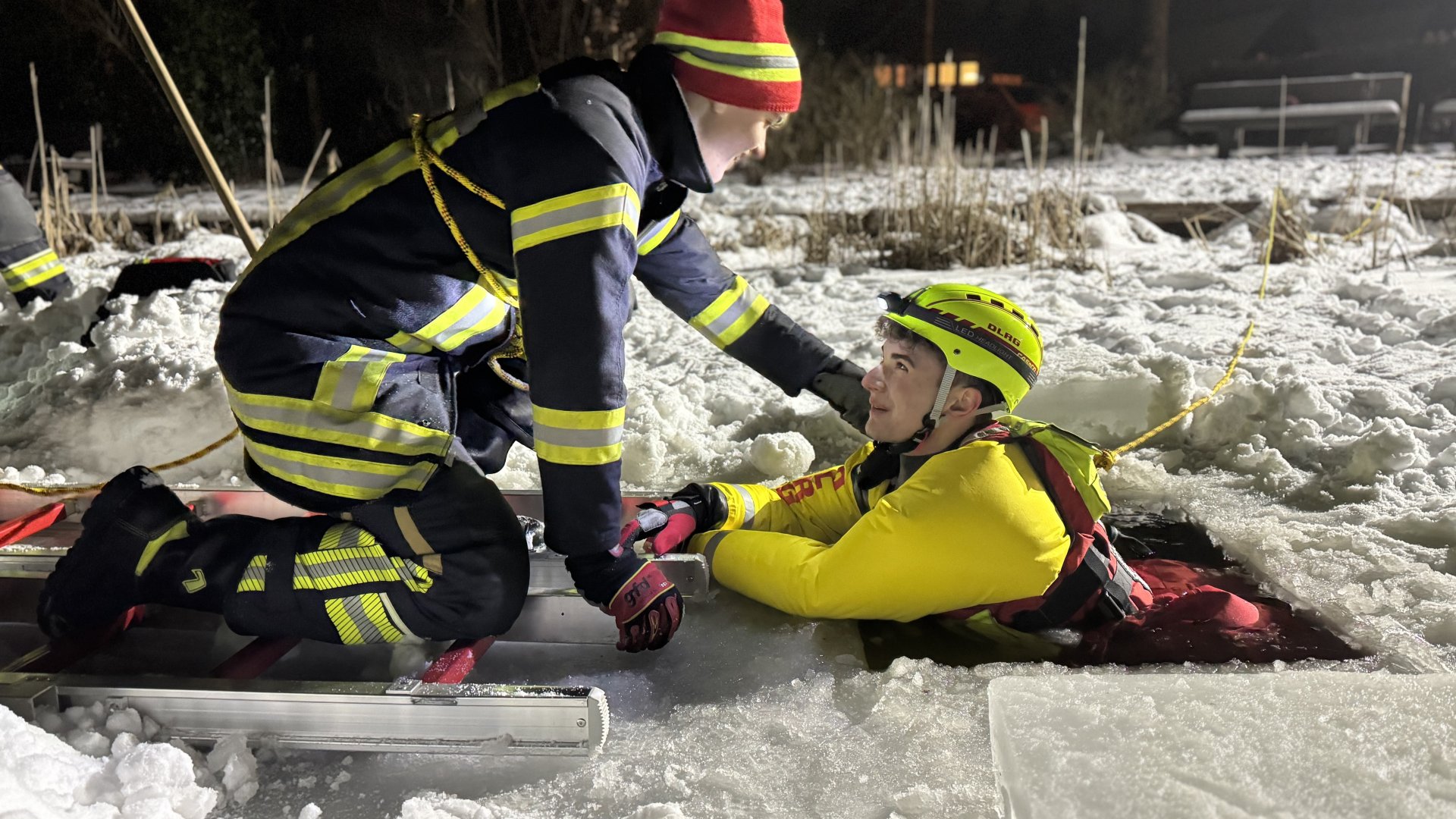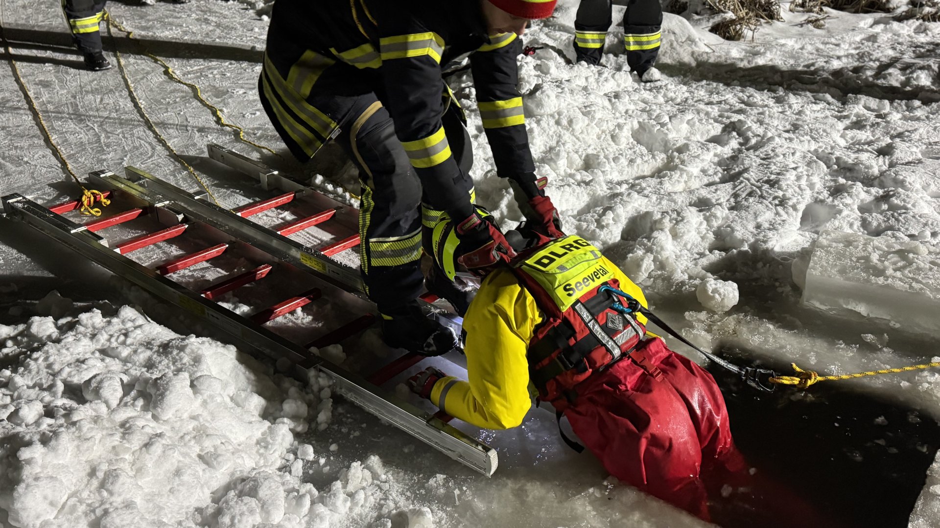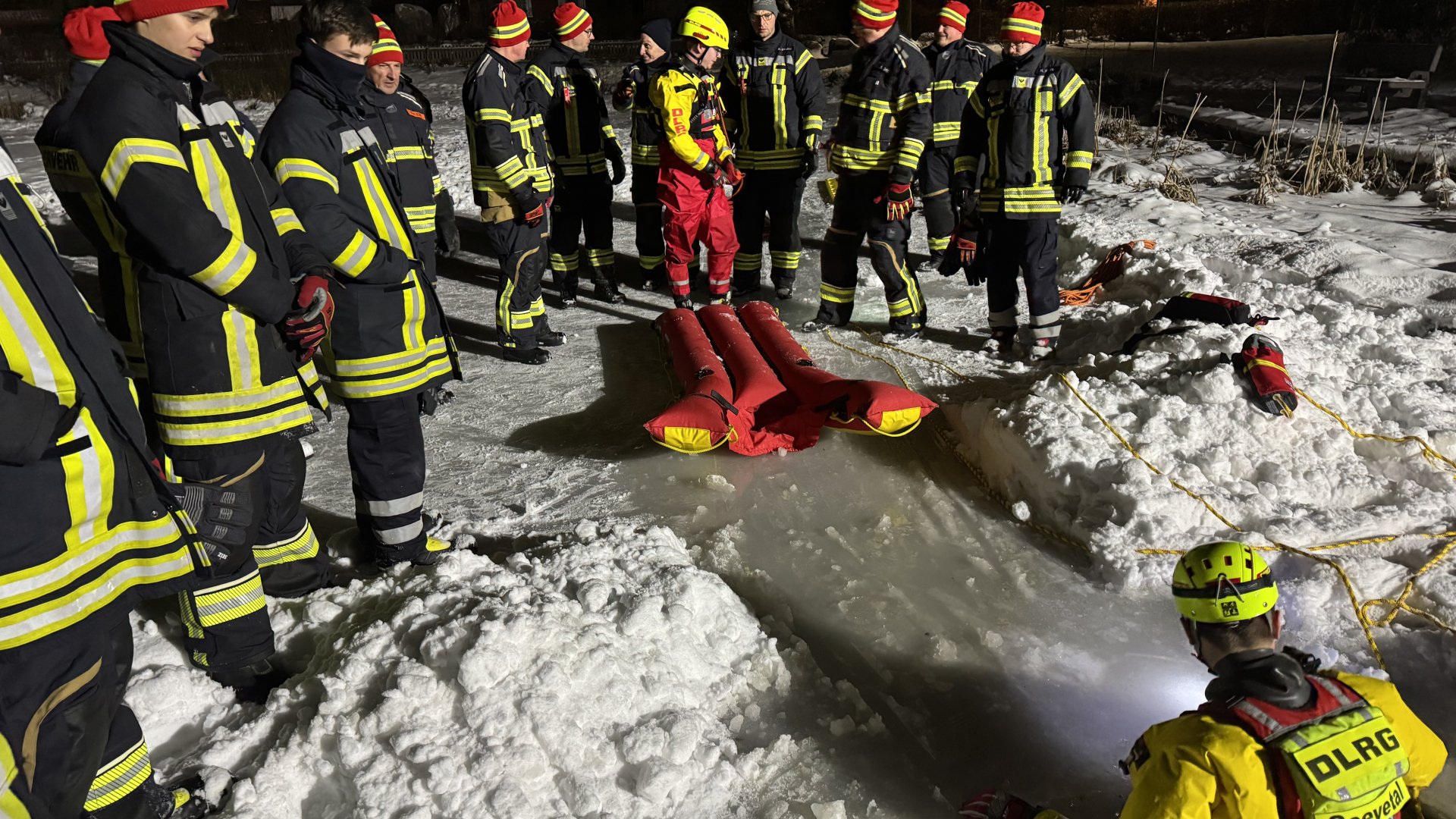 Am heutigen Dienstabend haben wir gemeinsam mit der DLRG Seevetal die Rettung von Personen aus Eisflächen geübt. Zahlreiche Einsatzkräfte trainierten verschiedene Rettungstechniken mit Leitern, Spineboard und Leinen. Auch das Thema Eigensicherung spielte dabei eine wichtige Rolle.